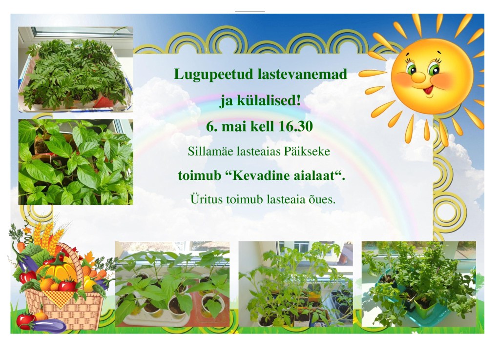 Sillamäe lasteaias Päikseke toimub kevadine aialaat, kus on võimalik soetada taimi, mille on kasvatanud lapsed ise. Laatal on esindatud köögiviljataimed, õitsvad taimed ja muud tublide väikeste aednike töö tulemused. Ootame kõiki linnaelanikke, aiandushuvilisi ja kõiki, kes soovivad oma aeda kaunistada või kasvatada head saaki.